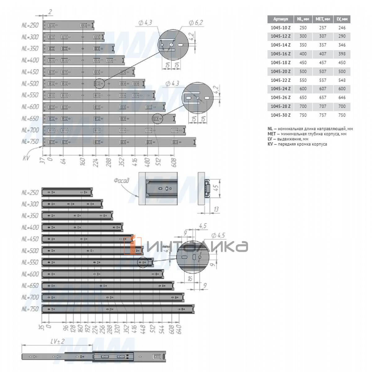 VEKTOR BS45 направляющие 250 мм, шариковые, h45, полн. выдвижения, оцинк., 1045-10 Z