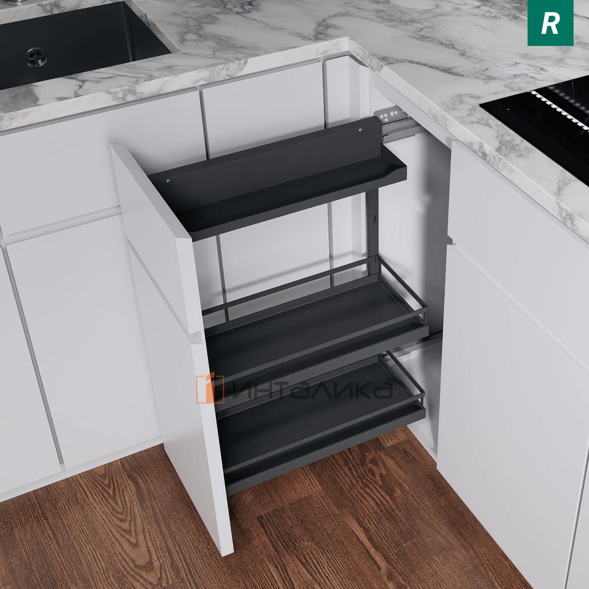 Выдвижной механизм KESSEBOHMER Comfort 400, 2 полки Arena style с доводчиком на закрывание, Anti-slip, H654, G28, правый, антрацит, 2377199846