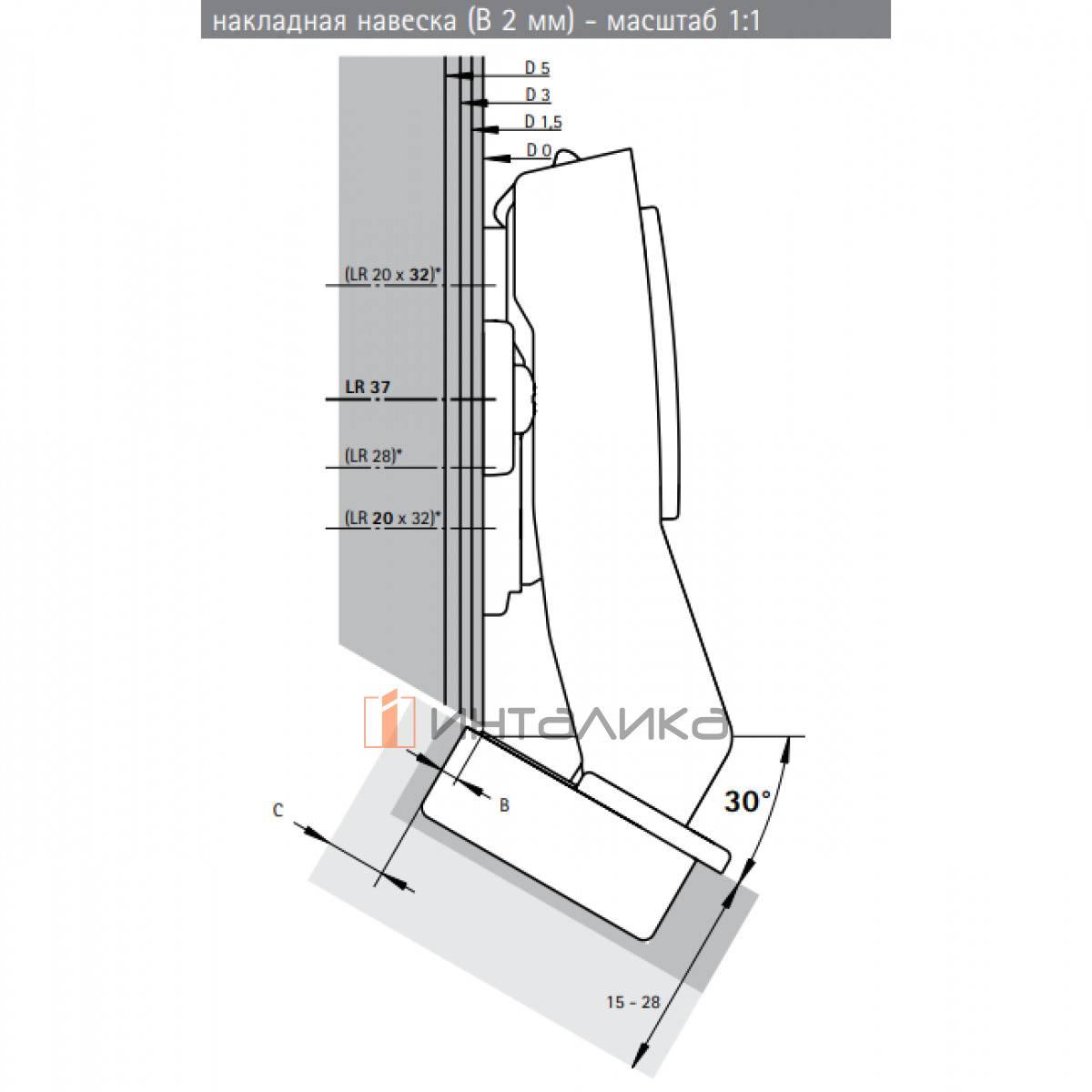 Применяется для открывания мебельных фасадов толщиной от 15 до 28 мм