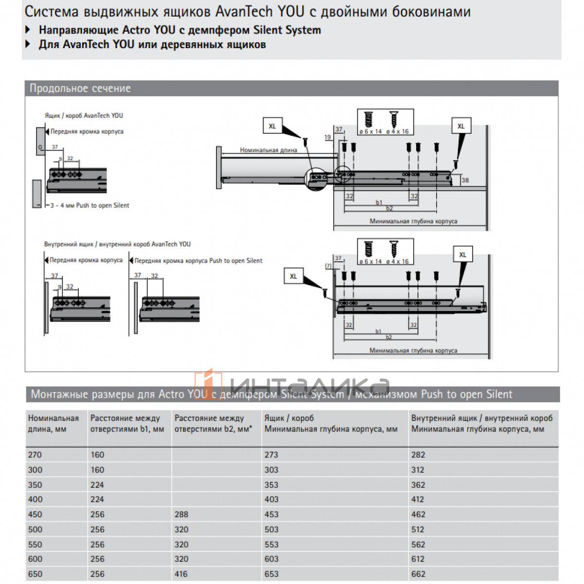 • Направляющие полного выдвижения для применения с системой выдвижных ящиков AvanTech YOU или с деревянными ящиками с фиксаторами