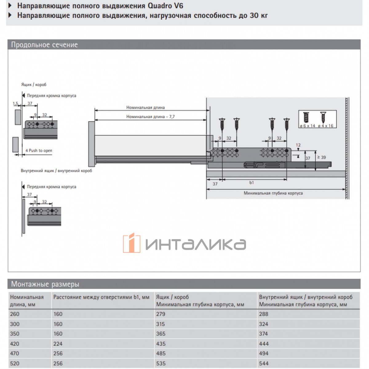 Направляющая HETTICH Quadro V6, Push to open, полное выдвижение, L350, ЕВ 20, G30, под замки, правая, 9105931