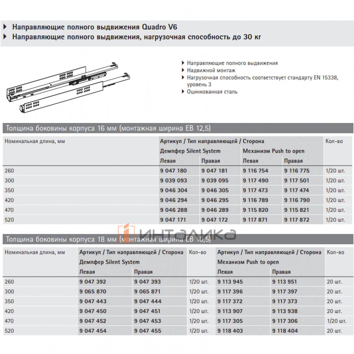 Направляющая HETTICH Quadro V6, Silent System, полное выдвижение, L350, ЕВ 20, G30, под замки, левая, 9047662