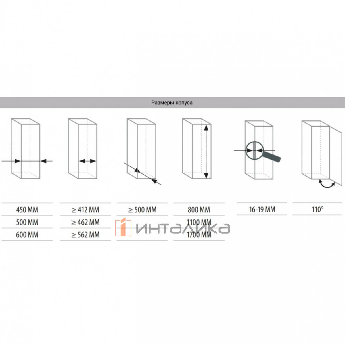 Угол открывания фасада 110 градусов (петли в комплект не входят, заказываются отдельно)