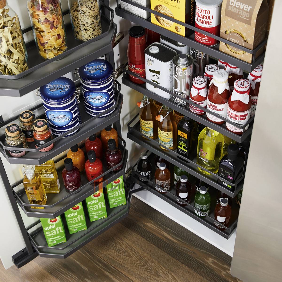 Полное выдвижение полок на раме, при открывании фасада, обеспечивает комфортный доступ и отличный обзор содержимого