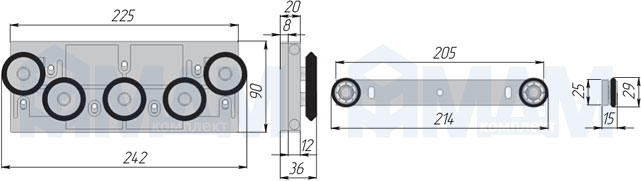 Комплектация: направляющая верхняя, верхний ролик, монтажная площадка верхнего ролика, нижний ролик, амортизатор 2 шт., крепеж для крепления к стене, винты для фиксации верхнего ролика 7 шт., стопор ролика 2 шт.