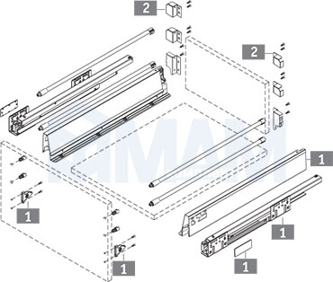 1. Комплект боковин, направляющих, фиксаторов к фасаду, фиксаторов задней стенки и заглушек
