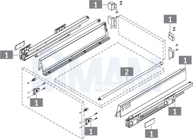 1. Комплект боковин, направляющих, фиксаторов к фасаду, фиксаторов задней стенки и заглушек