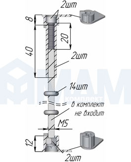 Комплектация: нижний L-образный элемент, блокирующая гайка, кольцо, муфта, верхний Lобразный элемент, фиксирующий винт (количество в комплекте указано на чертеже). Для одной двери.